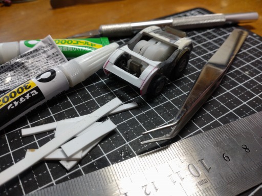 フロントを1mm厚のプラ板で作成。ゼンマイと車軸を仮付けし、しっかりとタイヤの収まりを確認しましょう。ズレてたら悲惨なので。