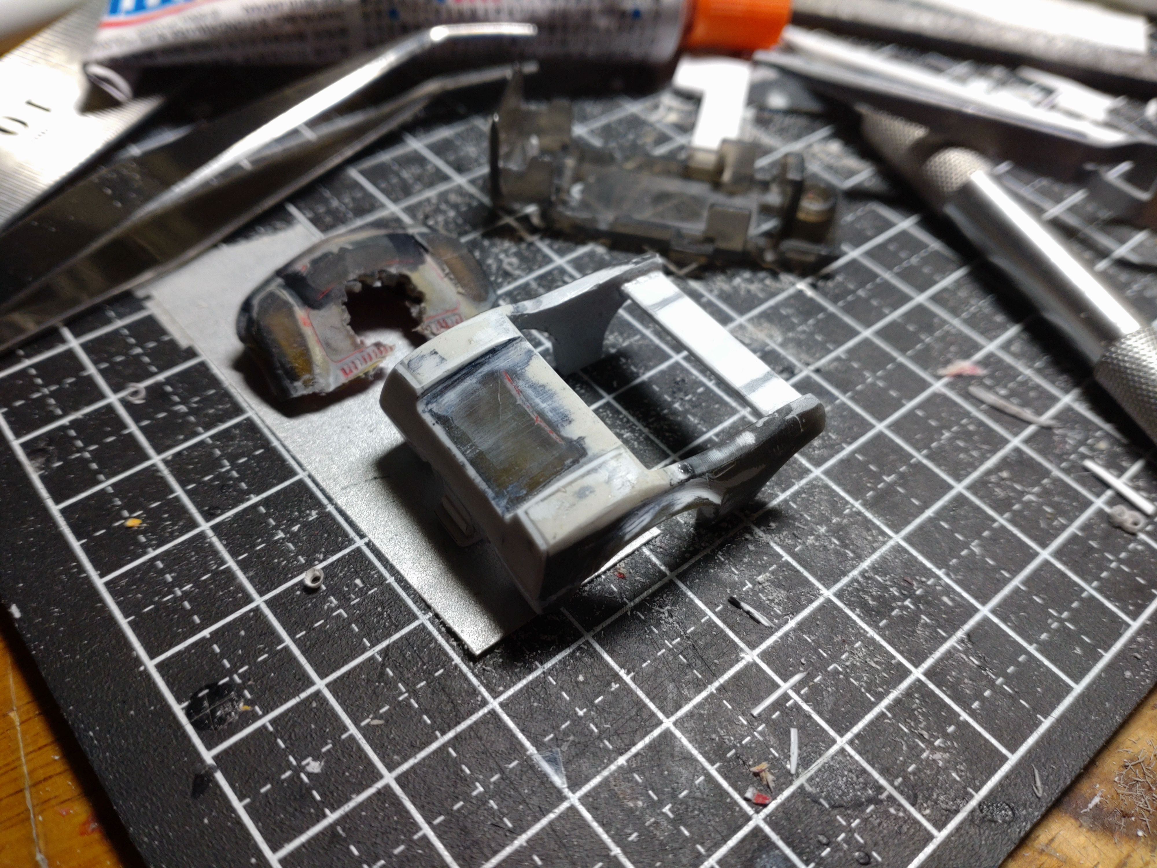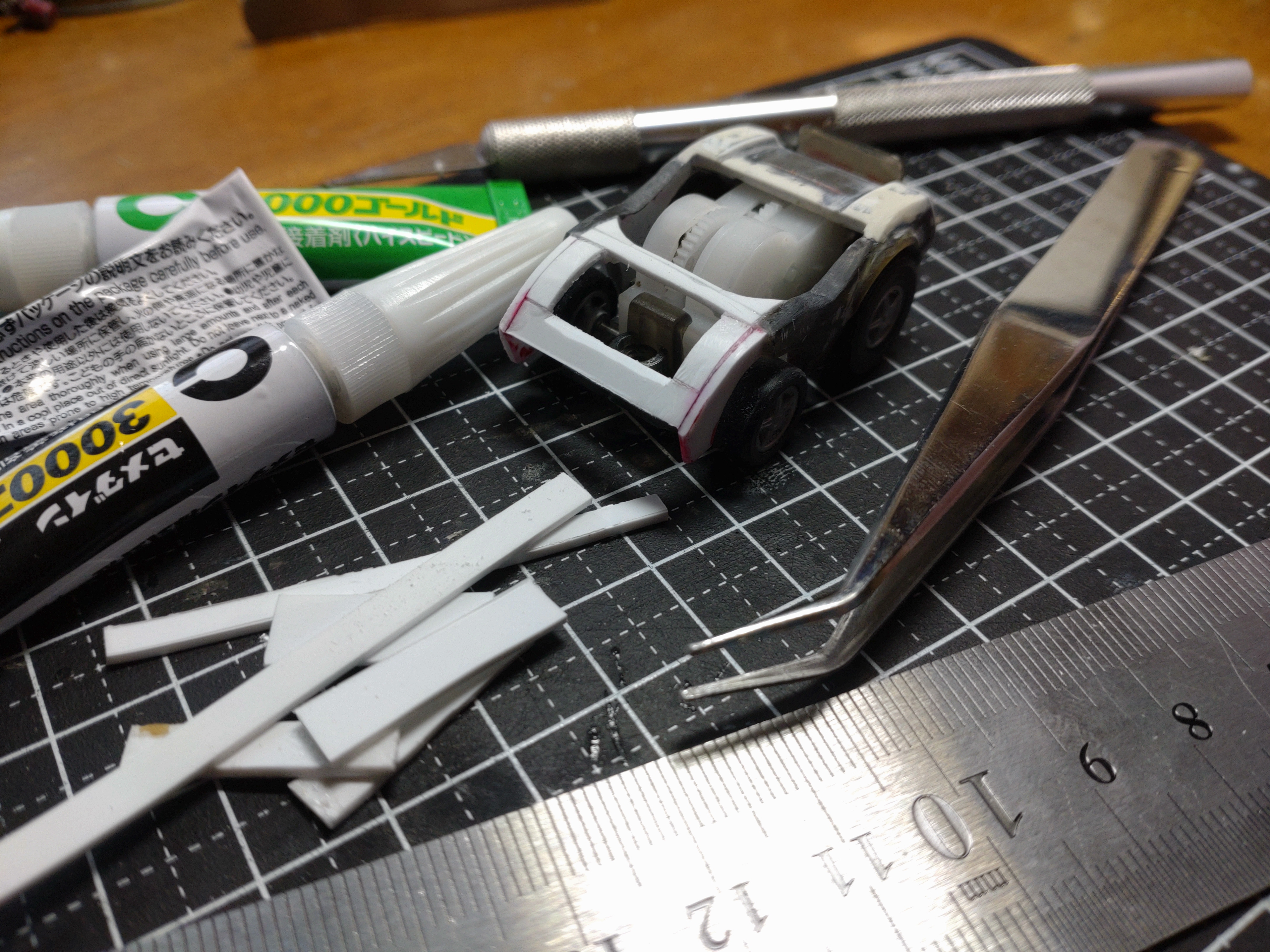 ちなみにこの道具たち、ピンセット以外、すべて100均の物だったり(パテとプラ板も100均) 金ねぇんだわ(^^;